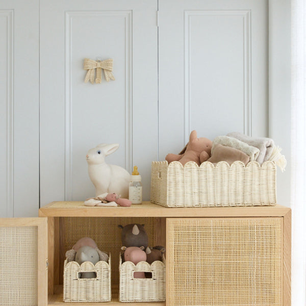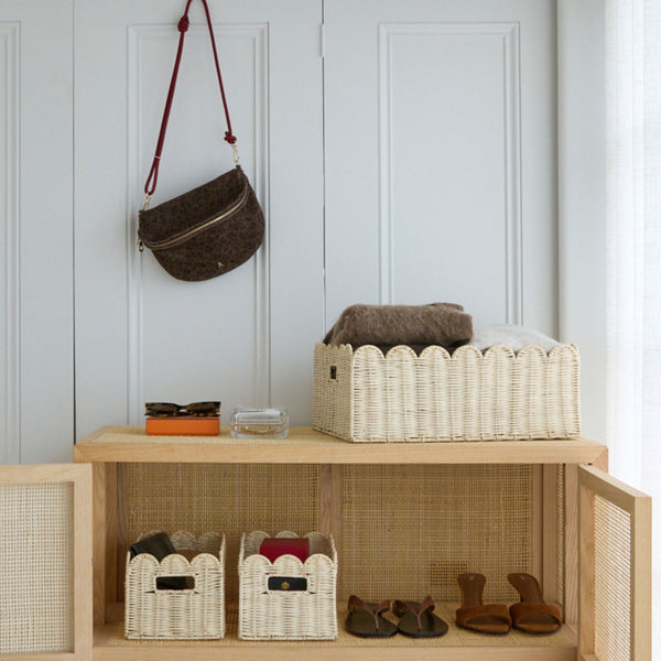 Petal is a set of three handwoven scalloped rattan baskets designed to help you hide the clutter without compromising on style. These baskets keep every room in the home functional and refined—perfect for nursery storage, bathroom towels, pantry essentials, or even folded pieces in a walk-in closet.