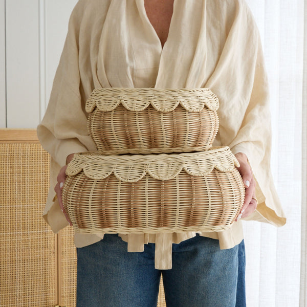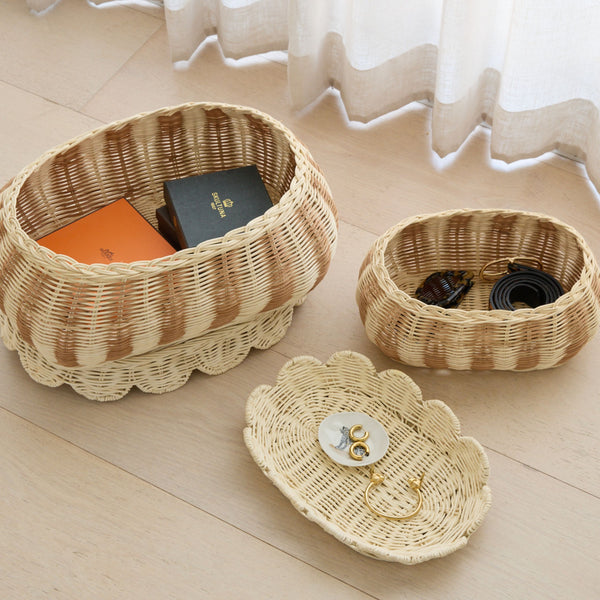 Flora, BEBE BASK’s award-winning original, now comes in Stripey — a fresh take on the scalloped basket set you already love, finished with bold woven stripes that turn everyday storage into a statement piece. Designed for life’s little things, this set of two handwoven baskets stores everything from remotes and jewelry to diapers, toys, and hair bows. The larger basket holds bulkier pieces, while the smaller keeps daily essentials within reach, with lids that double as trays for serving or display.
