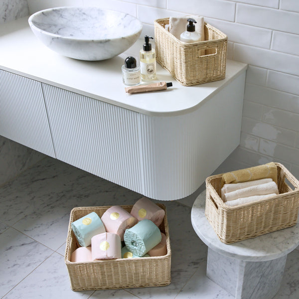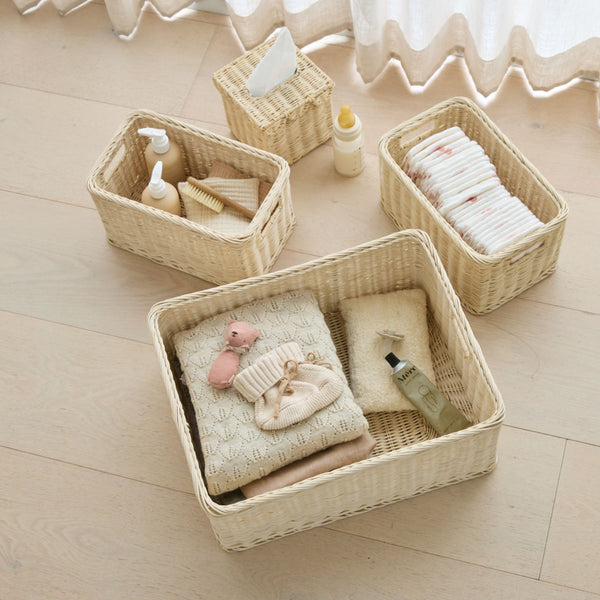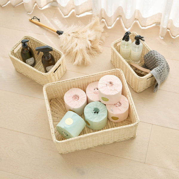 Marlowe is a set of three handwoven rattan baskets designed to hide clutter without sacrificing style. Perfect for storing towels in the bathroom, pantry essentials in the kitchen, folded pieces in a walk-in closet, or baby items in the nursery, this versatile set keeps every space in your home organized and refined. The clean rectangular silhouette brings a minimal, elevated look to shelves, countertops, and entryways.